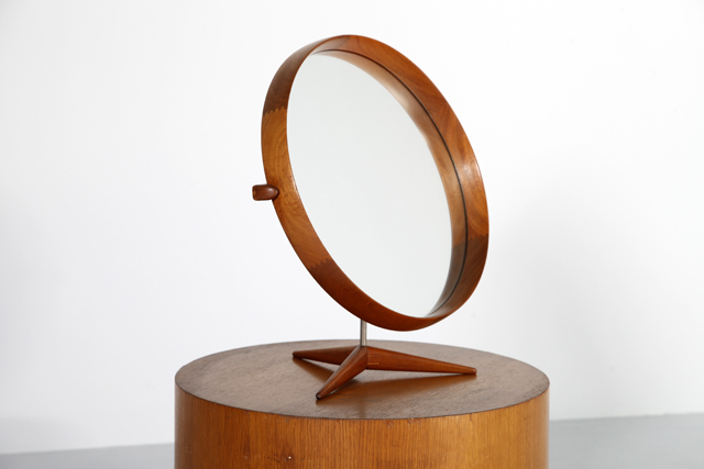 こちらのテーブル ミラーは、1960 年代にスウェーデンの Luxus社 が Uno & Östen Kristiansson のデザインに基づいて製作したものです。細くエレガントに伸びたスチールとチーク材の美しい木製トリポッドが見事なコントラストを成しています。手を広げるように背後から支えるユニークな形状、そして見事なフィンガージョイントにより細やかな味わいを持つ作品となっています。コンディション詳細・在庫確認・送料に関しましては、info@swankysystems.jp までお気軽にお問い合わせください。